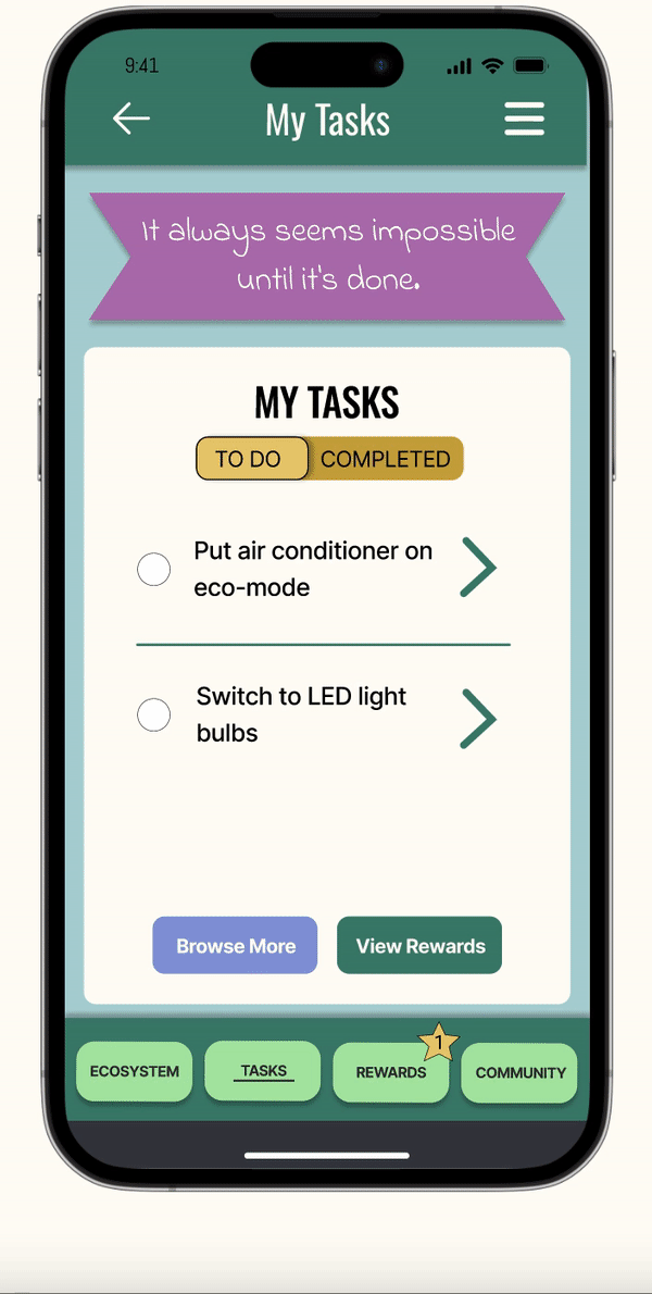 I wanted to see if I could gamify sustainability to make it seem more lighthearted and enjoyable, while encouraging more and more growth. I decided on having a rewards system and having multiple ways to earn rewards so each user could find something that was gratifying.